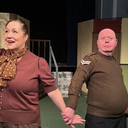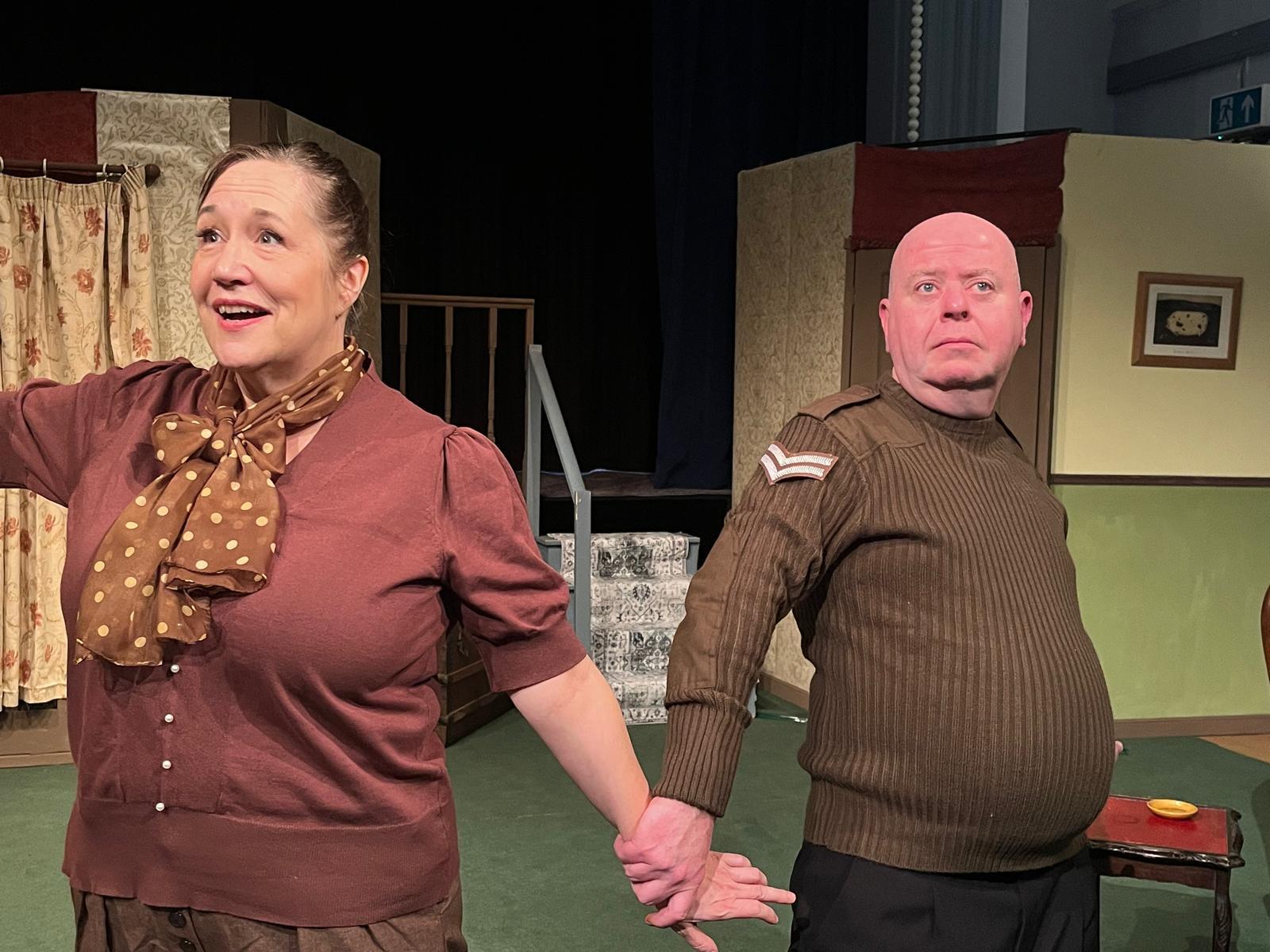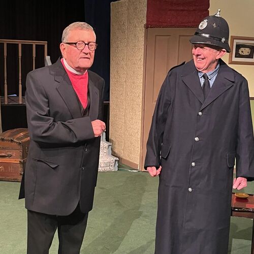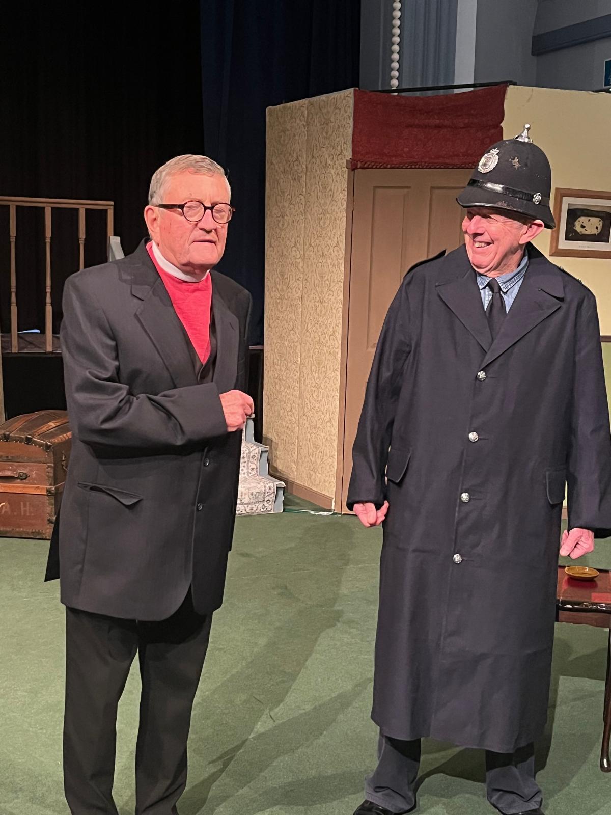 John Nelson as Clive, and Joe Coghlan as the intruding German PoW, embraced the silliness with enthusiasm: John brought bags of energy and some enjoyable physical gags, and Joe’s full bodied physicality during the frantic chases was another highlight. As the Bishop of Lax, Howard Eilbeck provided a counterpoint to the high energy of the play’s more frenetic characters, which worked particularly well during the recurring chase sequences. Keith Palmer’s bewildered Arthur Humphrey was endearing, and Colin Glennie as the authoritative Sergeant Towers injected additional humour during the latter part of the play.